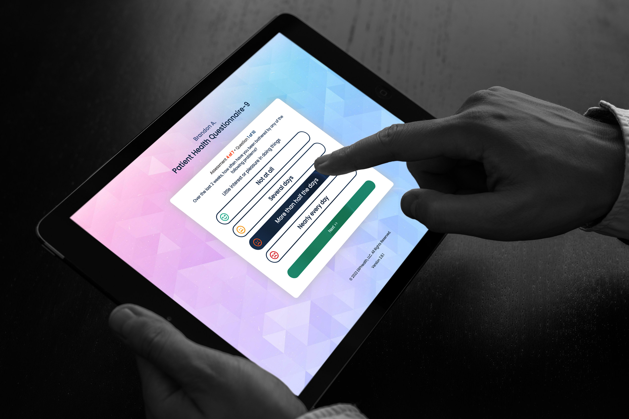 Each facility is provided with one or more TAP (tablet) devices which patients use to take assessments primarily. The interface was designed with no PHI (Protected Health Information) so providers can leave the devices with patients unsupervised.