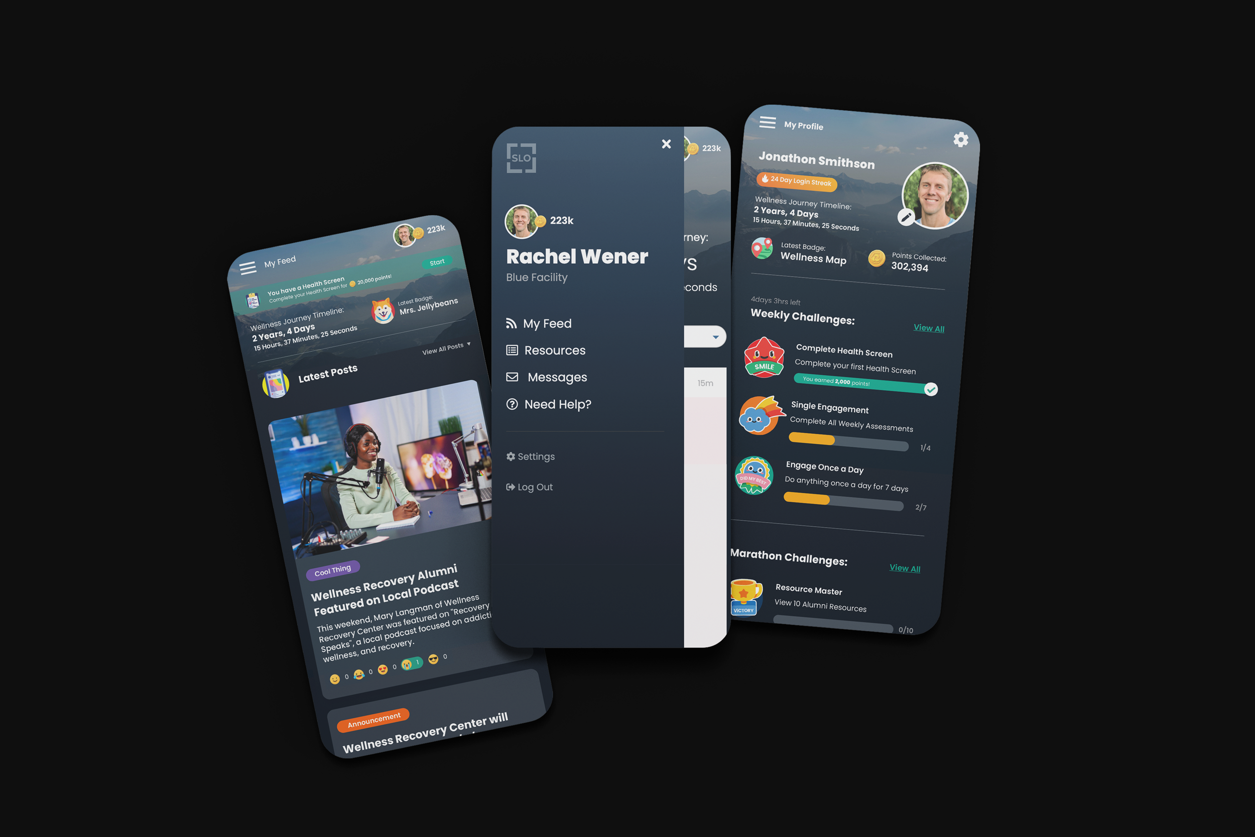 GRO is ERPHealth's alumni program and interface. It features a social feed that has custom posts from facilities as well as automated posts by ERPHealth. Once a patient is discharged into GRO, their Patient Portal interface switches to a GRO interface. The idea behind this design was to seamlessly transition from the Patient Portal into GRO, so patients recognize it. The key was striking the right balance of similiarities and differences so GRO felt familiar and understandable but also new and exciting.