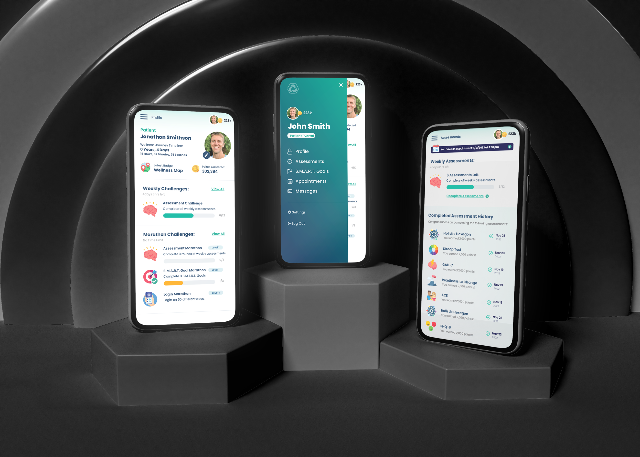The Patient Portal is a separate web app accessed by patients on their personal devices to complete their assessments and set their own goals. It is optimized for use on mobile, but works on all devices. Our latest initiative has been to add gamification to our system, incentivizing patients and alumni to log in and complete their assessments.