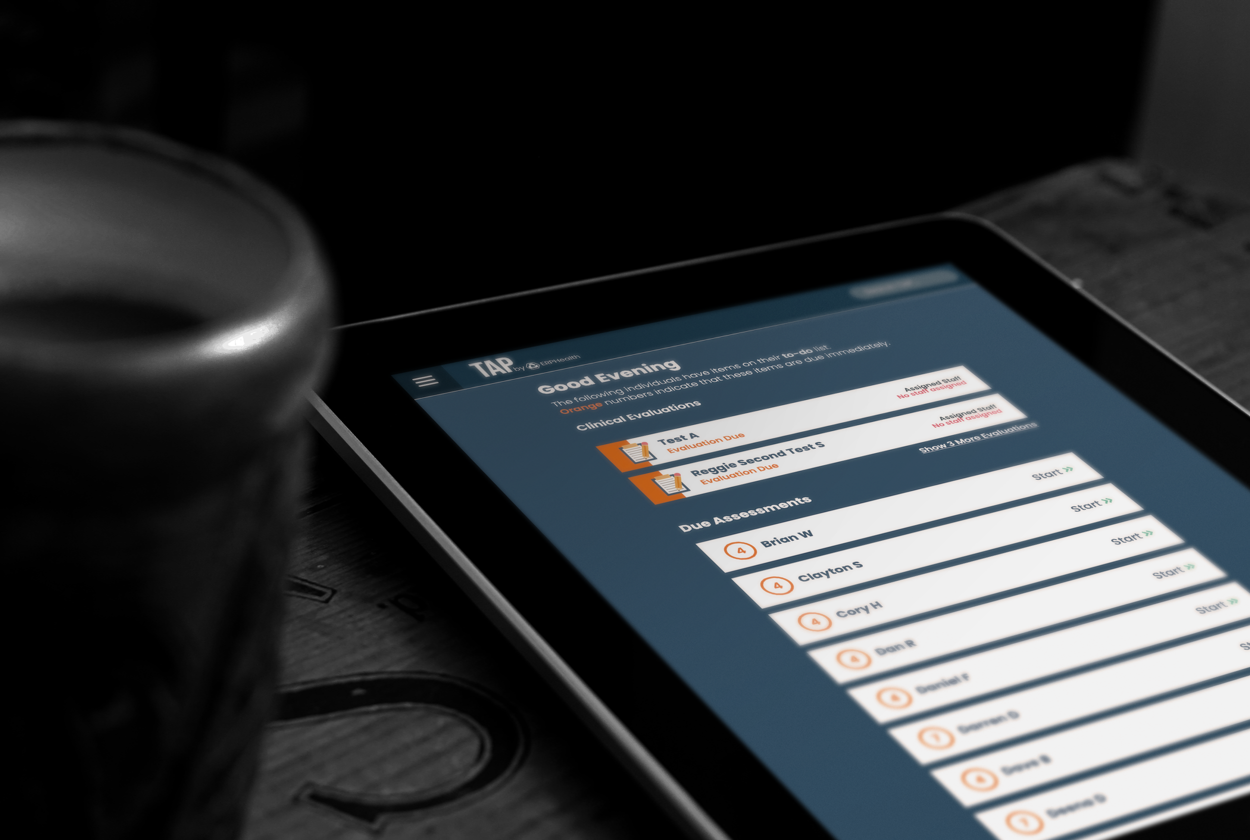 Each facility is provided with one or more TAP (tablet) devices which patients use to take assessments primarily. The interface was designed with no PHI (Protected Health Information) so providers can leave the devices with patients unsupervised.